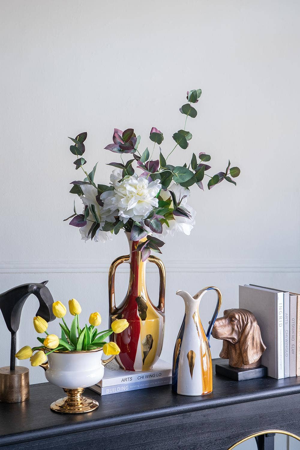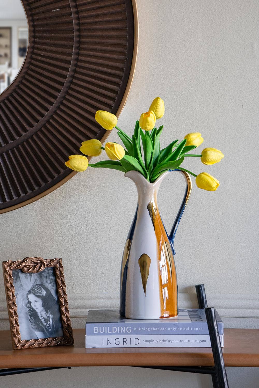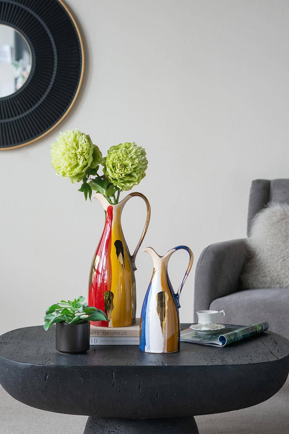 Made from high-quality, robust ceramic, this accent vase brings a fresh coat of style to the classic pitcher silhouette, with a blend of blue, white, and yellow hues combining to form a mesmerizing dripping effect. Whether displayed empty, added to a bold vignette, or paired with a lush floral arrangement, it will infuse your space with a burst of Art Deco charm.