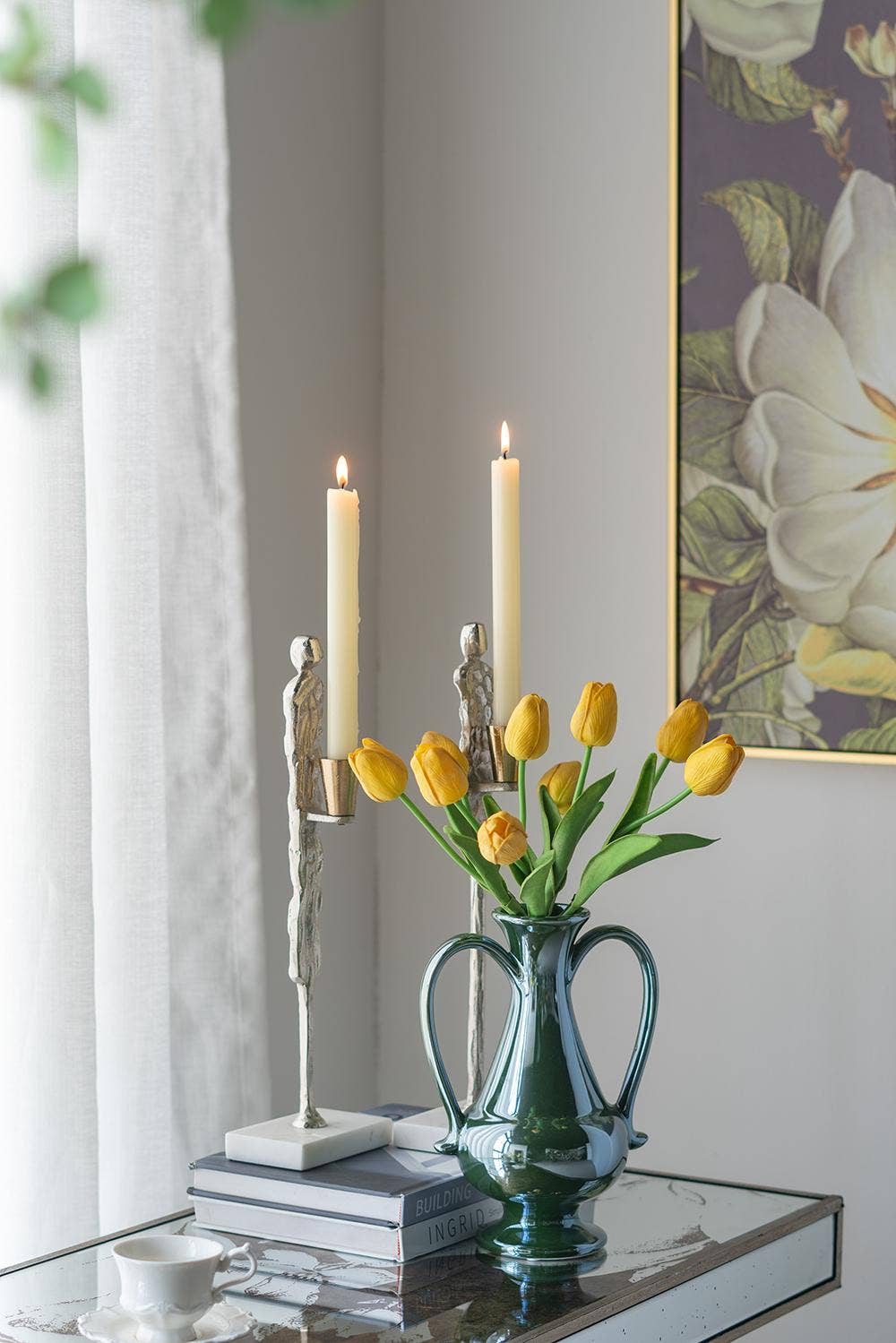 Bridging the gap between classic and modern motifs, this vase boasts a classic curved silhouette, complete with a short pedestal base, two large handles, and a flared opening. Finished in a deep, electroplated green to create a lustrous colorway, it is sure to capture the eye from anywhere in your living room, entryway, or dining room.