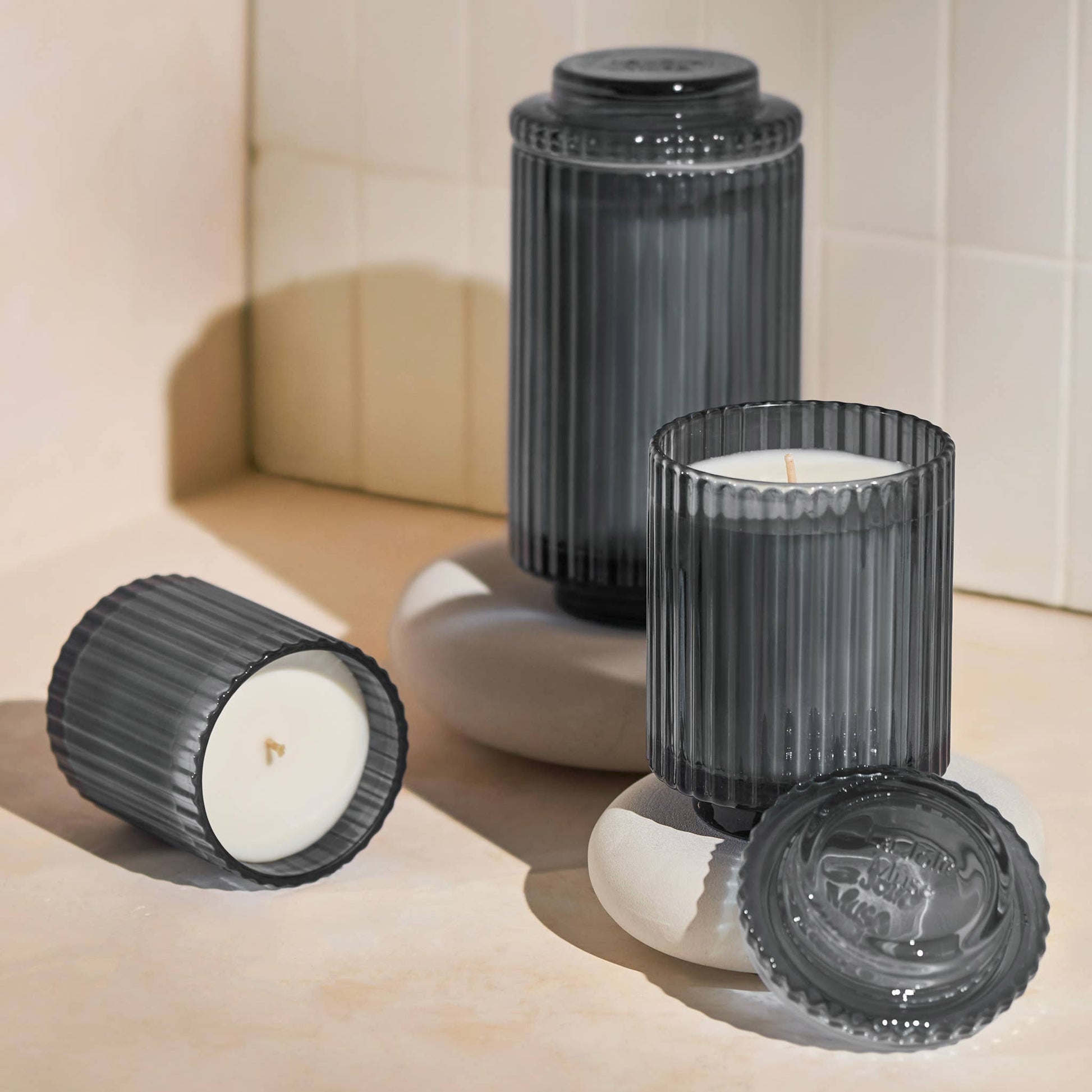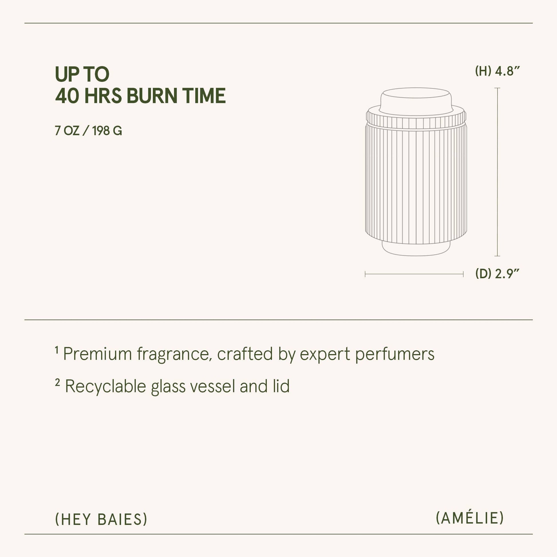 Elevate your space with Amélie: Timeless ribbed glass candles, reminiscent of the Acropolis grandeur. Available in calming colors, they offer a sustainable 40-hour burn with natural soy wax and seamlessly become elegant keepsake containers.