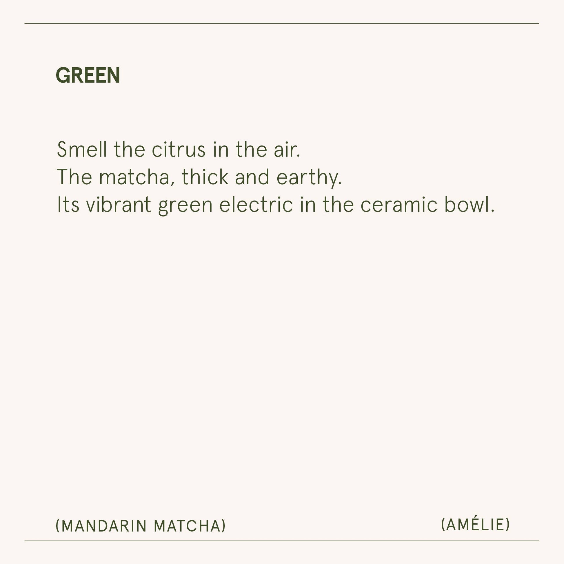 A vibrant blend of citrusy brightness and the calming essence of green tea, this refreshing and invigorating fragrance transports you to a peaceful teahouse surrounded by citrus groves.
