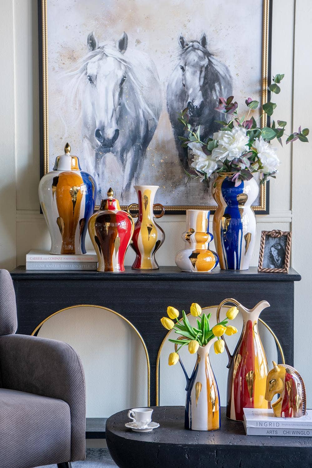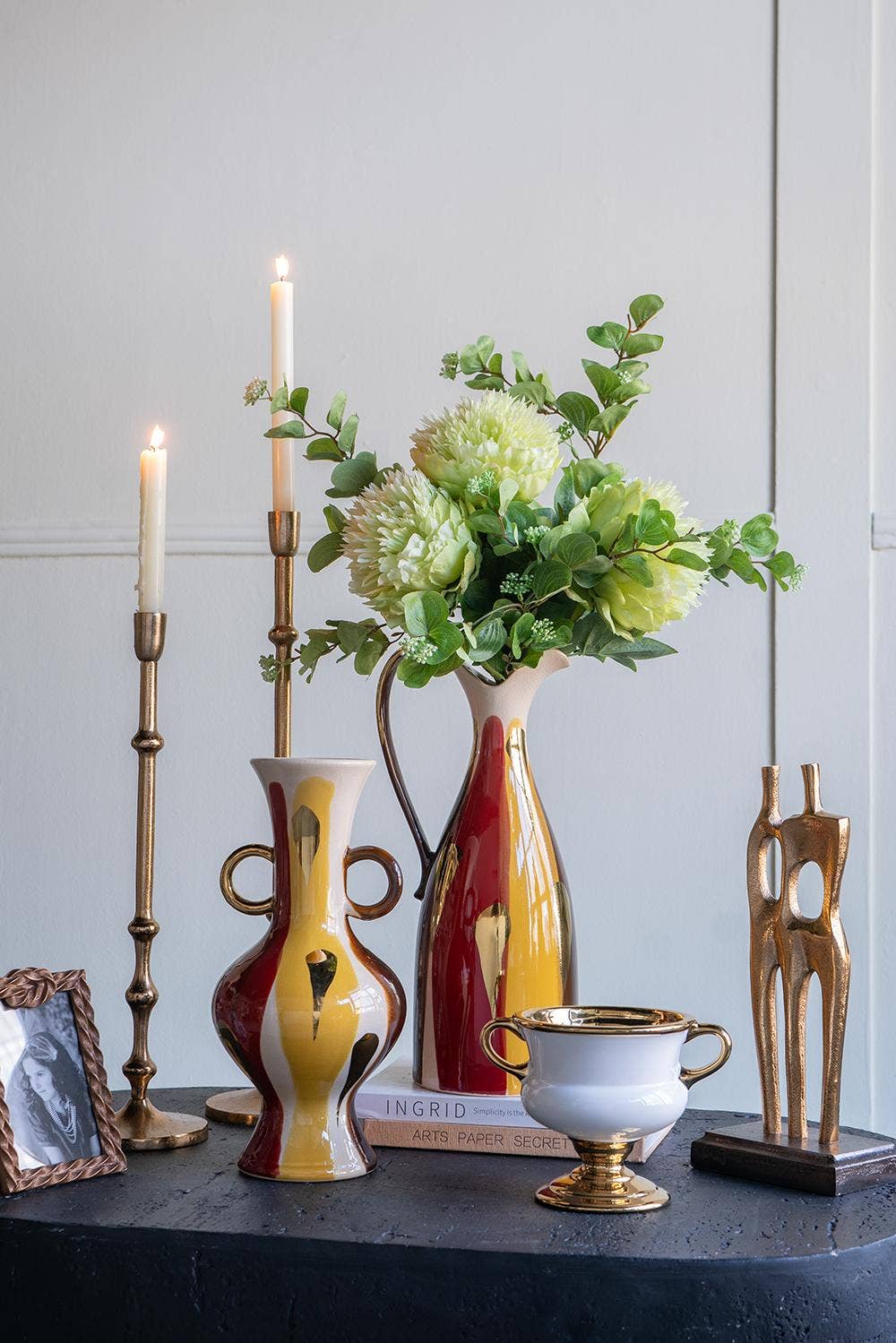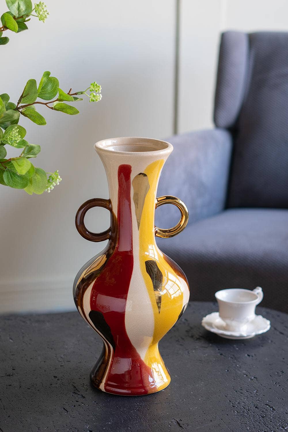 Made from high-quality, robust ceramic, this accent vase boasts a bulbous body, two small handles, and a flared opening. Finished in an irresistible blend of red, yellow, and brown tones, it will capture the eye of your guests whether displayed empty or paired with a vibrant floral arrangement.