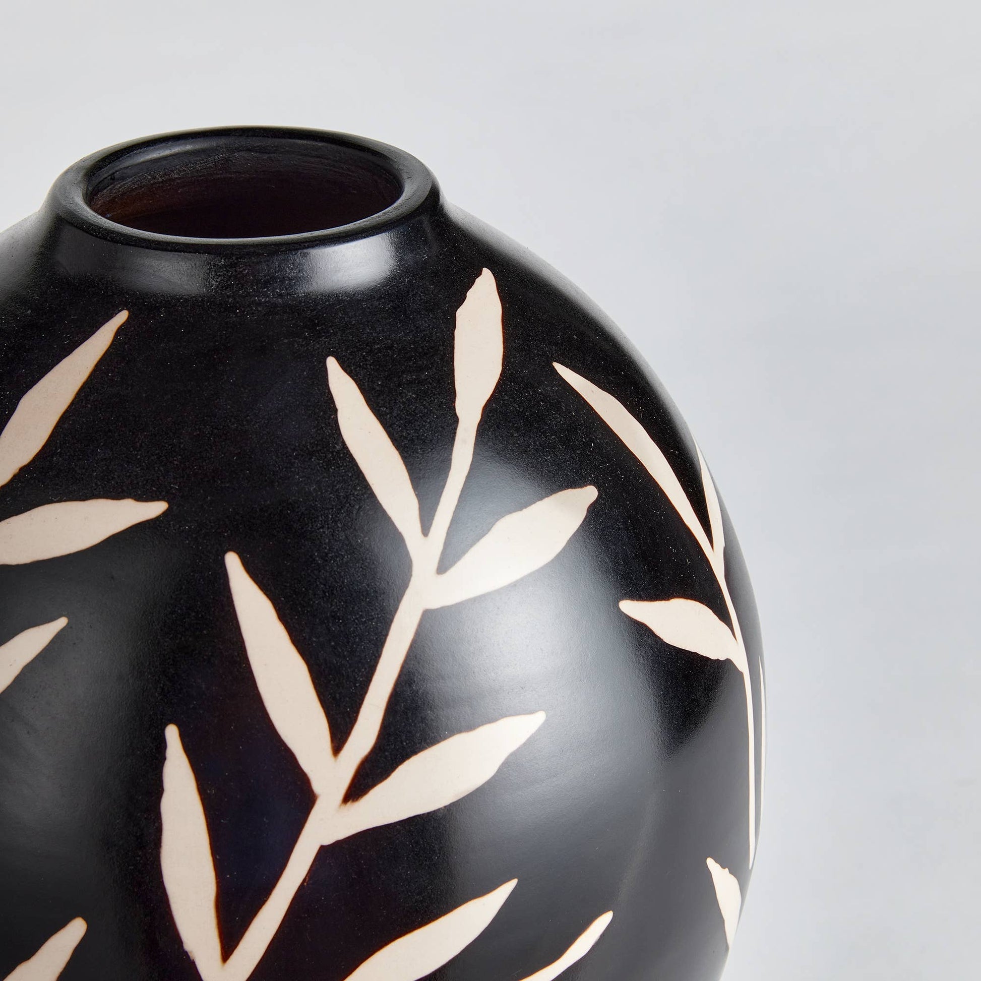 Handcrafted in Northern Peru using a classic batik process, the delicate vine motif is added as a ‘slip’ then after firing, a ‘paleta’ or wooden tool is used to gently remove it, revealing the light clay below. Color: Black/Ecru. Not watertight. Handcrafted by skilled artisans, each piece is an original and varies in size and color. Dust with dry cloth. Protect fine furniture by lining the interior of the pottery when necessary. Decorative interior use only.