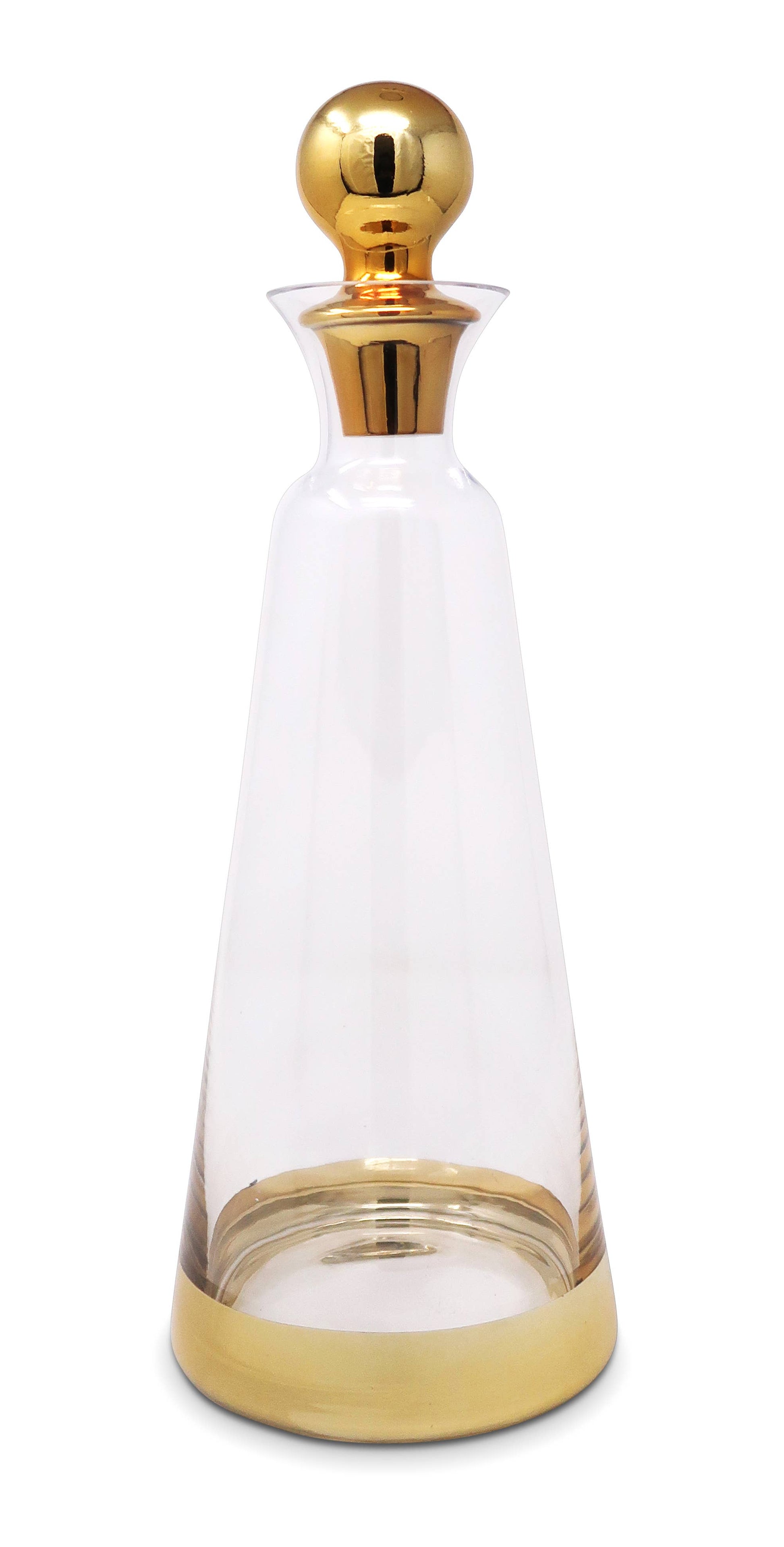Enhance the presentation of your home bar with our exquisite glass decanter. The sleek gold base and lid add a touch of luxury, while the glass body displays your choice of beverage. Ideal for entertaining guests or as a thoughtful gift, this decanter is a must-have accessory for any home bar.