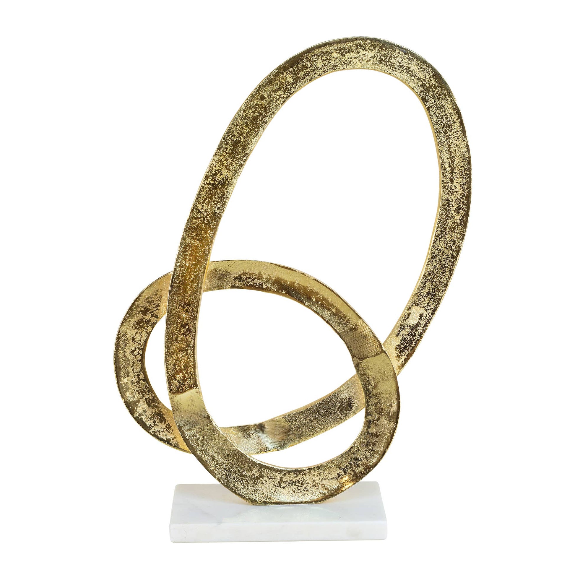 If you're looking for a piece that's sure to start a conversation, the Lex Abstract Statuary is perfect for you! It's a cast aluminum gold spiral oval shape with a white marble base with a hammered gold finish. This piece is sure to add a touch of elegance to any room. It features an abstract design made of two looped circles on a white base to keep it stable on flat surfaces. This sculpture is made of iron and has a warm metallic gold finish that will liven up the look. With this abstract sculpture decor, you can add a touch of glitz and elegance to your counters, consoles, and coffee tables.
